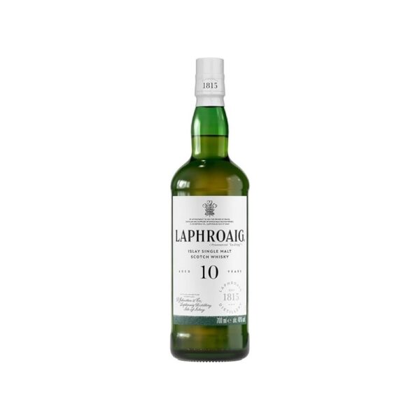 Laphroaig 10 años es uno de los single malts más emblemáticos de Islay, conocido por su carácter audaz, ahumado y medicinal que ha definido la marca por generaciones.