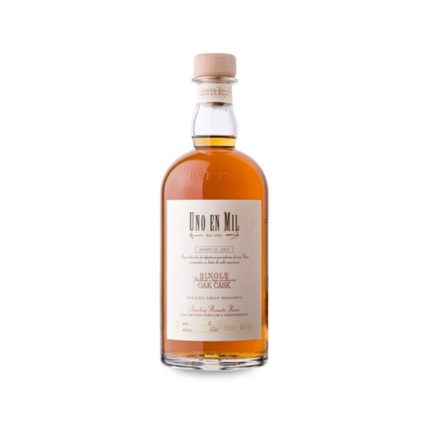 Uno en Mil Solera Gran Reserva 70 cl, de Sánchez Romate, es un brandy de Jerez con una personalidad refinada y compleja. Fundado sobre la prestigiosa solera Cardenal Mendoza desde 1888, este destilado sorprende por su armonía, ligereza y elegancia, que se mantienen hasta el final.